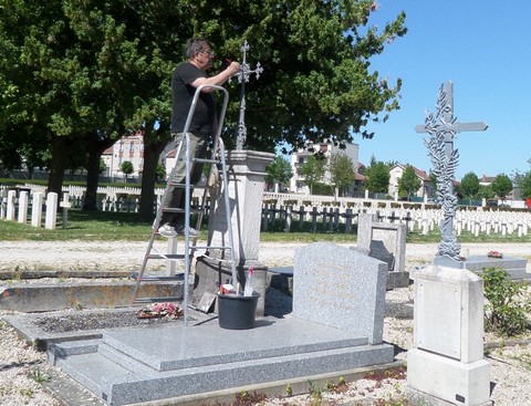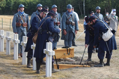 Sous un soleil de plomb que n’auraient pas redoutés les coloniaux de l’époque, les soldats de l’Association « les Poilus de la Marne » ont amené sur leur emplacement les deux cercueils recouverts d’un drapeau tricolore.
